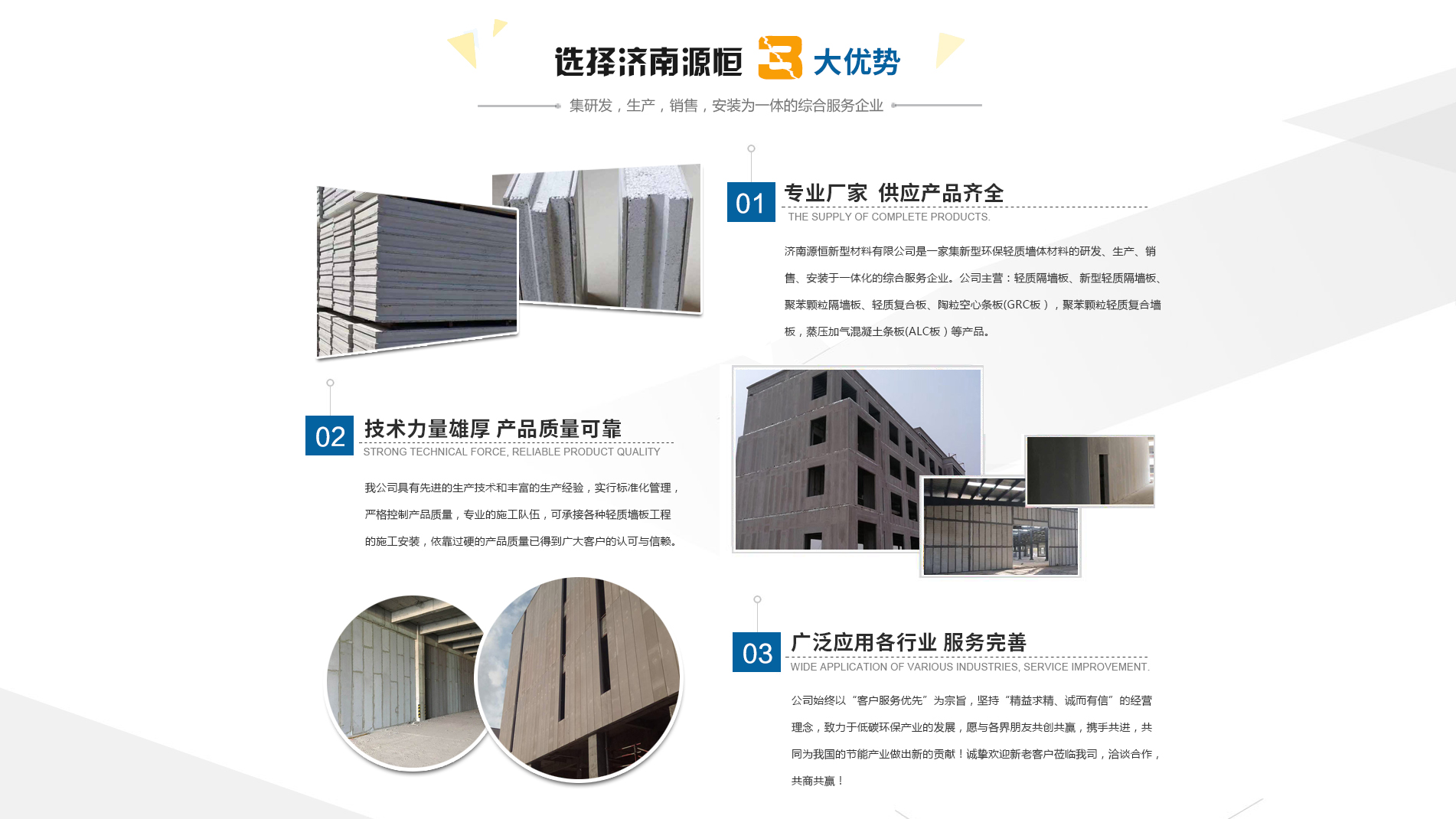 濟(jì)南源恒新型材料有限公司坐落于美麗的泉城濟(jì)南,是集新型環(huán)保輕質(zhì)墻體材料的研發(fā)、生產(chǎn)、銷(xiāo)售、安裝于一體化的綜合服務(wù)企業(yè)。我公司具有的生產(chǎn)技術(shù)和豐富的生產(chǎn)經(jīng)驗(yàn),為您提供輕質(zhì)隔墻板、新型輕質(zhì)隔墻板、聚苯顆粒隔墻板、輕質(zhì)復(fù)合板、陶粒空心條板(GRC板),聚苯顆粒輕質(zhì)復(fù)合墻板,蒸壓加氣混凝土條板(ALC板)等產(chǎn)品,本公司有專(zhuān)的施工隊(duì)伍,可承接各種輕質(zhì)墻板工程的施工安裝。輕質(zhì)隔墻板是國(guó)家推廣使用的新型輕質(zhì)、綠色無(wú)害建材,是墻改節(jié)能政策大力扶持的環(huán)保節(jié)能產(chǎn)品,是發(fā)達(dá)國(guó)家普遍采用的新型墻體材料。濟(jì)南源恒新型材料有限公司實(shí)行標(biāo)準(zhǔn)化管理,嚴(yán)格控制產(chǎn)品質(zhì)量,依靠過(guò)硬的產(chǎn)品質(zhì)量已得到廣大客戶(hù)的認(rèn)可與信賴(lài)。公司產(chǎn)品遍布各大城市,與國(guó)內(nèi)多家客戶(hù)建立了良好的合作關(guān)系。公司始終以“客戶(hù)服務(wù)優(yōu)先”為宗旨,堅(jiān)持“精益求精、誠(chéng)而有信”的經(jīng)營(yíng)理念,致力于低碳環(huán)保產(chǎn)業(yè)的發(fā)展,愿與各界朋友共創(chuàng)共贏(yíng),攜手共進(jìn),共同為我國(guó)的節(jié)能產(chǎn)業(yè)做出新的...